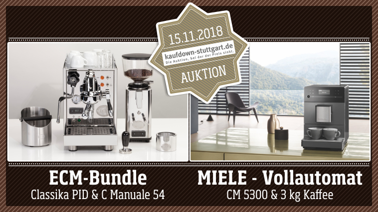 Dieses mal sind wir in der Rückwärtsauktion der Stuttgarter Zeitung / Stuttgarter Nachrichten mit ein ECM Komplett-Set für Espressoliebhaber und einem MIELE Kaffeevollautomaten dabei.