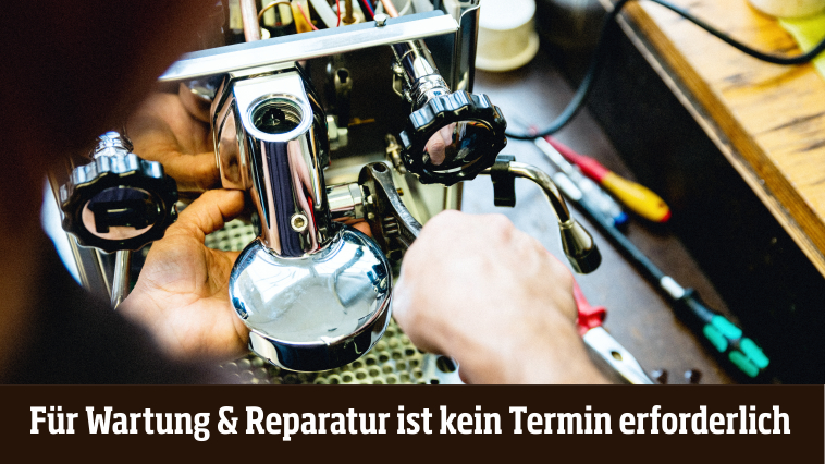 Für die Wartung oder Reparatur Ihrer Siebträgermaschine bzw. Ihres Kaffeevollautomaten ist kein Termin erforderlich. Bringen Sie Ihr Gerät einfach während unserer Öffnungszeiten vorbei.